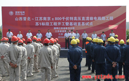 8月26日上午10時,山西晉北—江蘇南京±800千伏特高壓直流輸電線路工程蘇1標段工程開工暨基礎施工首基試點活動在徐州豐縣趙莊鎮(zhèn)舉行。這標志著首條由國網(wǎng)江蘇省電力公司負責建設管理的特高壓直流線路工程正式開建。