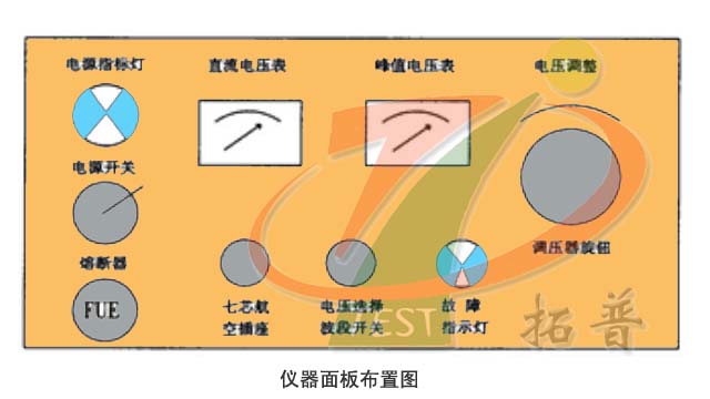 3.將儀器面板上的“電壓調(diào)整”旋鈕向左旋到底(旋不動為止),保證開機(jī)前調(diào)壓器輸出電壓為零,然后將儀器電源插頭插好,并接通儀器面板上的電源開關(guān).此時電源指示燈(綠色)亮,直流電壓表和峰值電壓表均在另位。