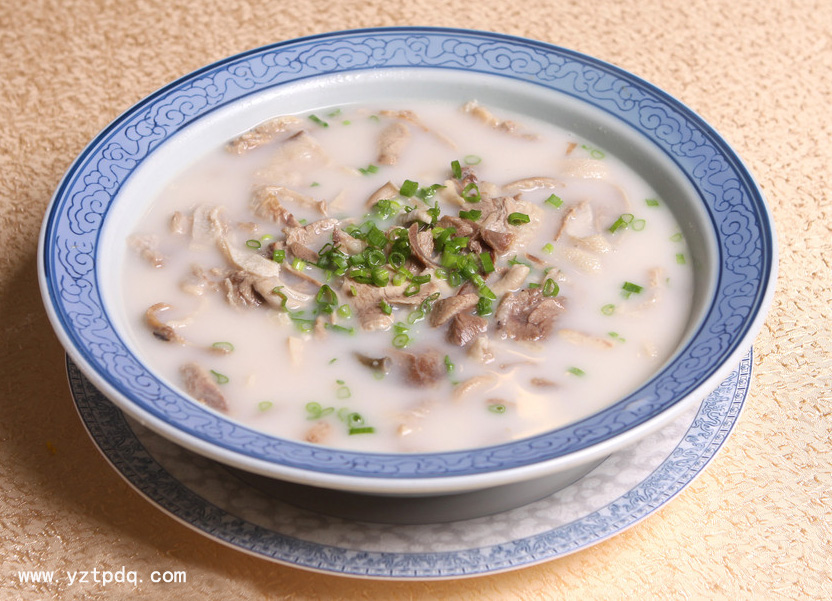 揚(yáng)州高郵十大名菜之一“三陽(yáng)開(kāi)泰”,即高郵羊肉湯,為高郵臨澤鎮(zhèn)名菜。臨澤鎮(zhèn)地區(qū)湖蕩多、草灘廣、水草肥,故這里的羊肉湯無(wú)腥味,熱能高,暖性強(qiáng).含脂少,膽固醇低,味美可口。寒冬臘月,喝高郵羊肉湯,如同三月的艷陽(yáng)在心中暖洋洋的,通體舒暢,故名三陽(yáng)開(kāi)泰。