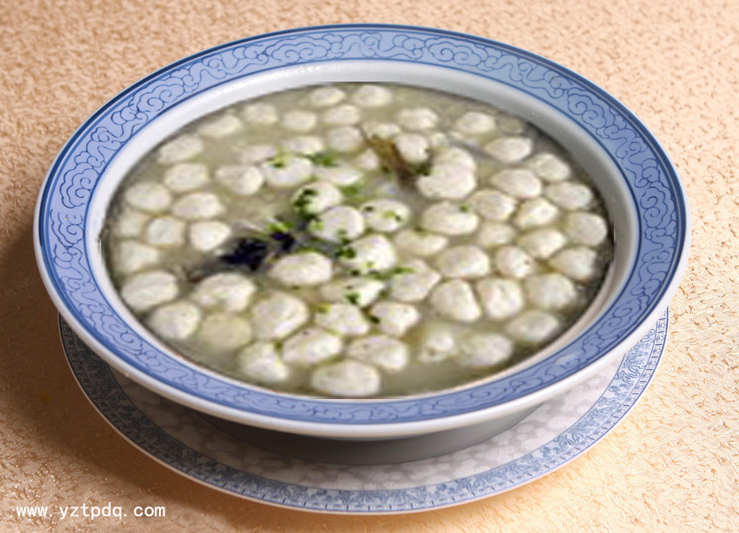 玉珠藏丹就是夾心魚園,揚(yáng)州高郵十大名菜之一。魚園象征玉珠,夾心的肉園為丹。巧妙地將魚肉結(jié)合在一起,使珠中藏肉味,丹外聞魚香。