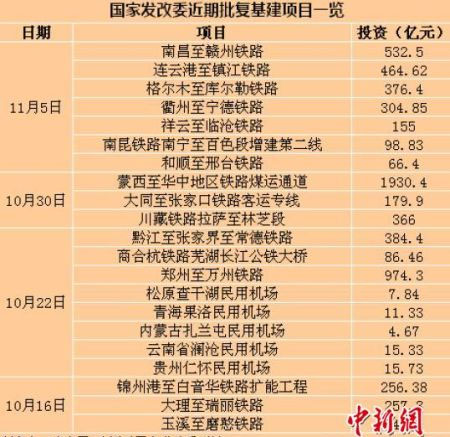 在今年10月16日到11月5日這21天的時間里,發(fā)改委先后批復了16條鐵路和5個機場共21個基建項目,這些項目總投資達6933.74億元。專家表示,當前中國經濟下行壓力較大,發(fā)改委密集批復基建項目,釋放出明顯的穩(wěn)增長意圖。
