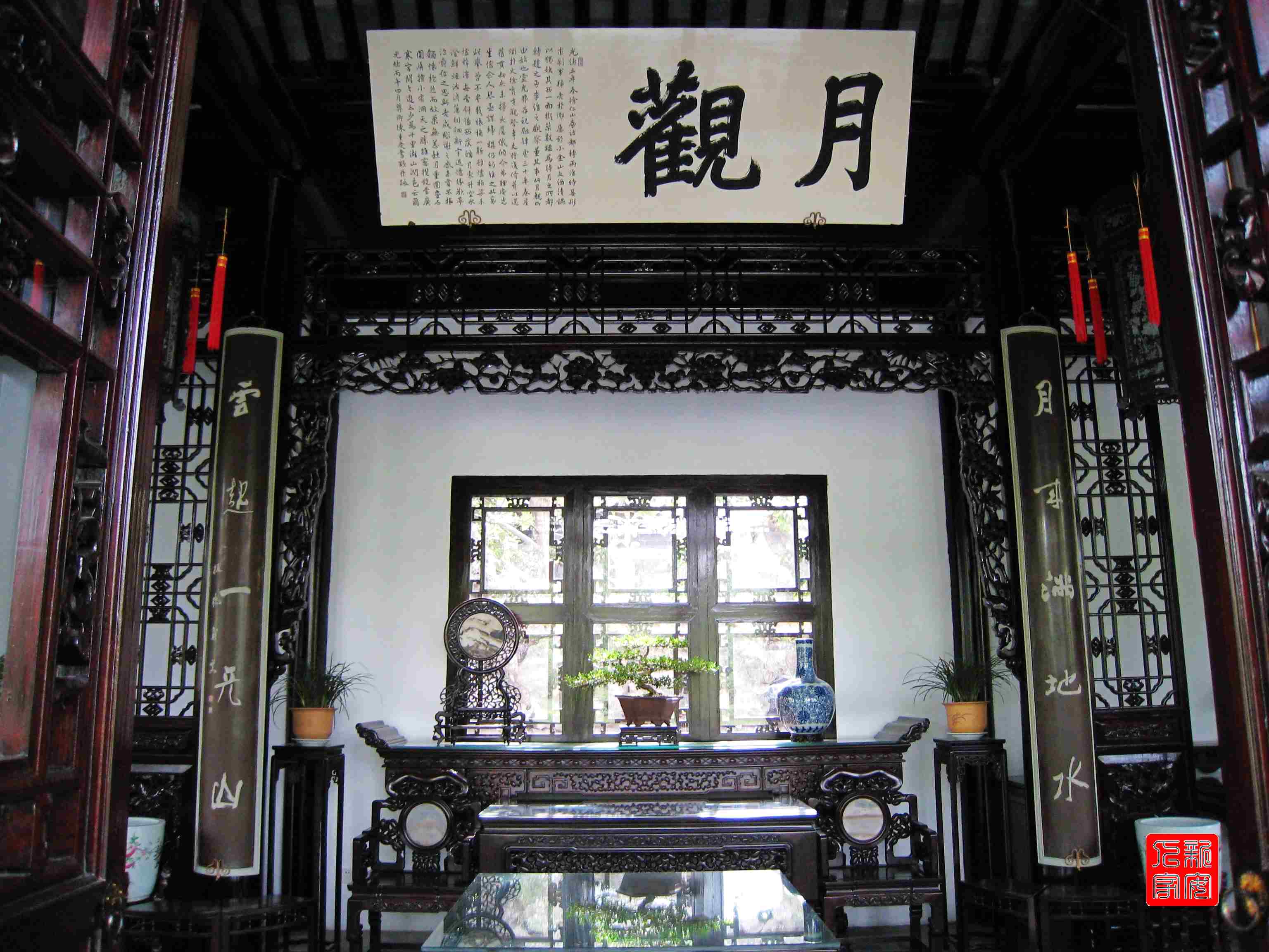 月觀中的海梅家具也很有特點,雕刻的內(nèi)容都和賞月有關(guān)。那些蓮花、鴛鴦、荷葉,藕節(jié),無不自然生動,是揚州木雕工藝的代表作品。