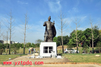 據(jù)施工人員介紹,吳王夫差雕塑設(shè)置在廣場東西中軸線的西端,材質(zhì)為青銅,基座高度約2.5m,雕塑高約6m,總體高度約8.8m。據(jù)工程負(fù)責(zé)同志介紹,吳王夫差雕塑今年5月13日確定了中標(biāo)供應(yīng)商,中標(biāo)供應(yīng)商在吸納評(píng)標(biāo)專家和部分揚(yáng)州文史專家的意見后,對(duì)雕塑的造型、服飾、面部神態(tài)等細(xì)節(jié)進(jìn)行了完善。據(jù)悉,這次先行吊裝的為1:1的玻璃鋼雕塑,重約1噸。為什么不直接吊裝青銅雕塑?專家告訴記者,這是想經(jīng)過一定時(shí)間的現(xiàn)場展示,來征集市民的意見,在征集市民意見截止之日起60天內(nèi),完成最終的青銅雕塑制作和現(xiàn)場安裝。