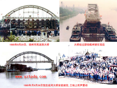 在揚州水利局檔案室內(nèi),記者看到一份檔案寫著這樣的文字:20世紀50年代后期,揚州大運河改道由灣頭瓦窯鋪至六圩入江,為方便運河兩岸交通往來,1960年6月建成揚州京杭運河大橋。橋?qū)?2米,行車道寬7米,長194米,計有7個孔,中間為通航孔,凈跨50米,系鋼筋混凝土系桿拱,其余6孔為長20米的“T”型梁,是當時揚州區(qū)境內(nèi)規(guī)模最大、技術(shù)標準最高的公路橋。1985年9月在原橋南側(cè)新建的運河大橋,與改造后的老橋合并為一體,原來大橋的系桿拱成了“廢物”,寶應(yīng)正打算建大橋,于是決定整體搬到寶應(yīng)。