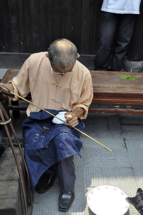 日常使用陶瓷器很普及,因此各地都能看到補碗匠,他們一般沒有固定的攤位,挑一副簡易擔子,內存必要的工具和材料,走街穿巷攬生意做,從那“補碗哦,補碗哦……”吆喝的長腔中,你能發(fā)覺他們不是本地人。操此營生的,以江西老表居多,景德鎮(zhèn)是我國著名的瓷都,產(chǎn)量豐富,由此衍生出“補碗”行業(yè)也是很自然的事情。有一句歇后語:江西人補碗——自顧自,即是從補碗鉆孔時發(fā)出的“口茲口茲”有節(jié)奏的聲響引發(fā)的,它似乎沒有譏諷老表的意思,而是抨擊自私自利的行為。隨著補碗行當?shù)南?,這句歇后語也已淡出江湖。補碗匠大多身懷絕技,小到酒杯,大到幾個人合抱不過來的醬缸,他們都有本領使之“完璧”。有些人家,祖?zhèn)鞯恼滟F瓷器有了裂紋,未雨綢繆,預先給“補”起來;而尋常人家,生活節(jié)儉,只要“補”比買新的便宜,一只破碗他們都不舍得丟棄,湊合著補一補再用。當然,如今可不這樣了,瓷器磕破了,一扔了之,誰也不會想到去“補”。
