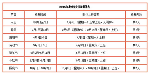 2016年元旦、春節(jié)、清明節(jié)、勞動(dòng)節(jié)、端午節(jié)、中秋節(jié)和國慶節(jié)放假調(diào)休日期的具體安排通知如下。